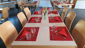 Schön dekorierte Tische und leckere Mahlzeiten warten auf die Besucherinnen und Besucher. Zum Mittagstisch sind alle herzlich willkommen.
